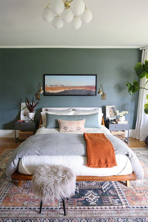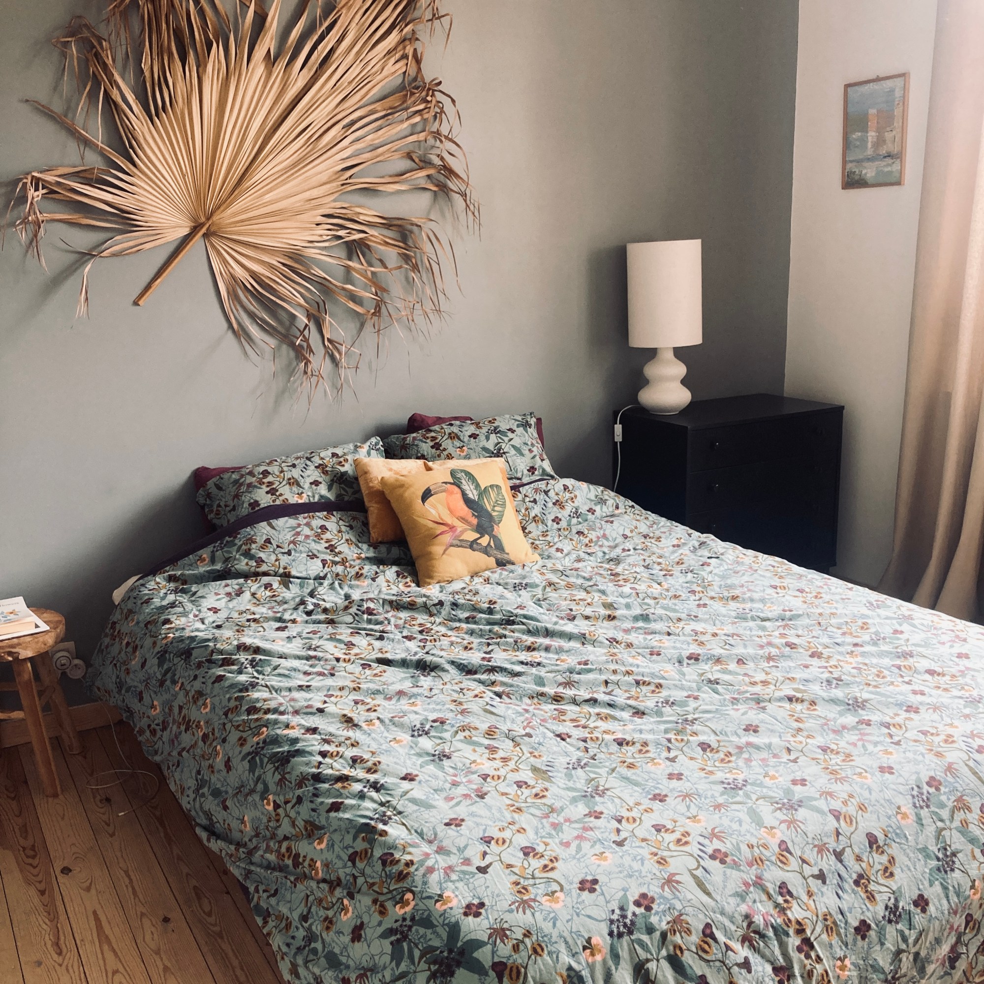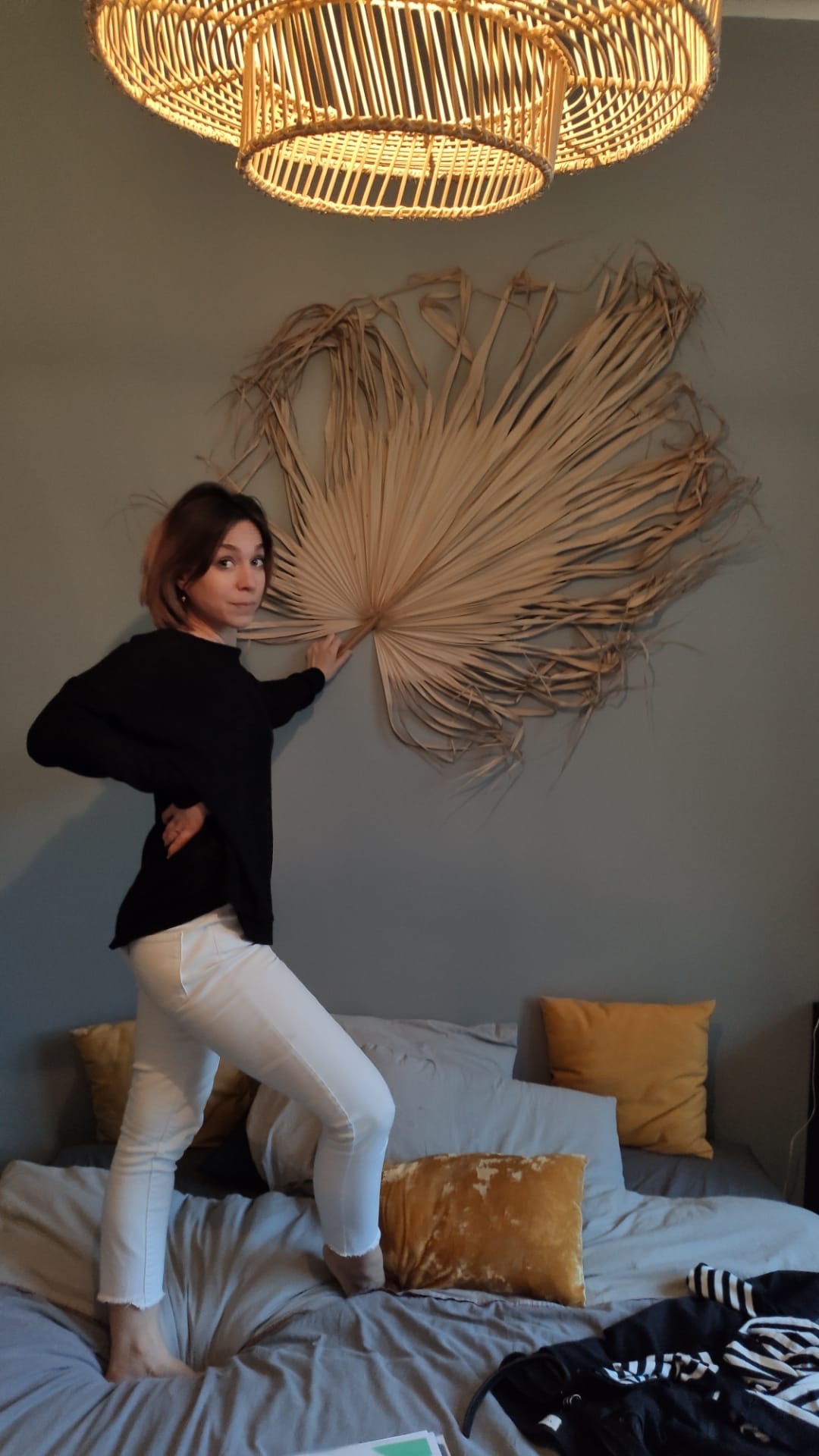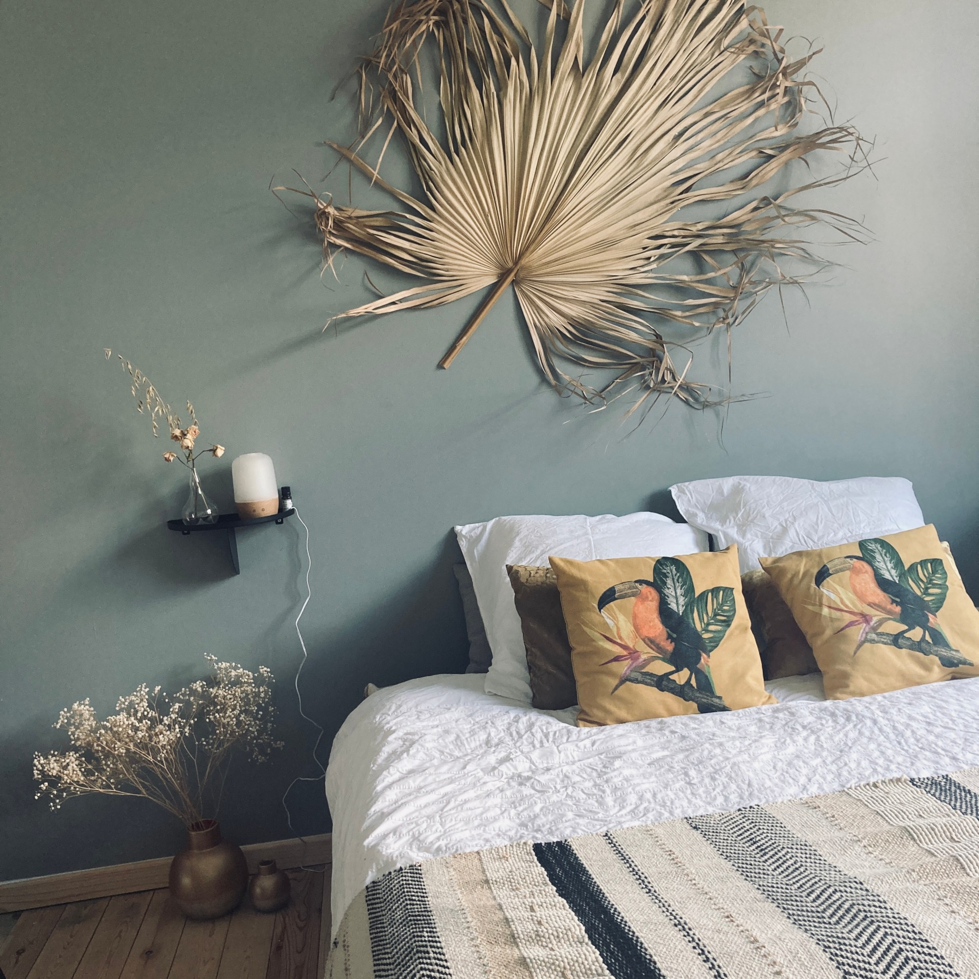 1- non, je n’ai pas peint toute la chambre. Juste un mur qui permet de diviser la pièce en 2 espaces distincts, exprès. Ceci aussi afin de casser l’effet un peu trop boho de mon style et de me pousser hors de ma zone de confort. Après tout, la décoration c’est un jeu. Il faut oser prendre des risques … et on a pas grand chose à perdre… ou plutôt beaucoup à y gagner.