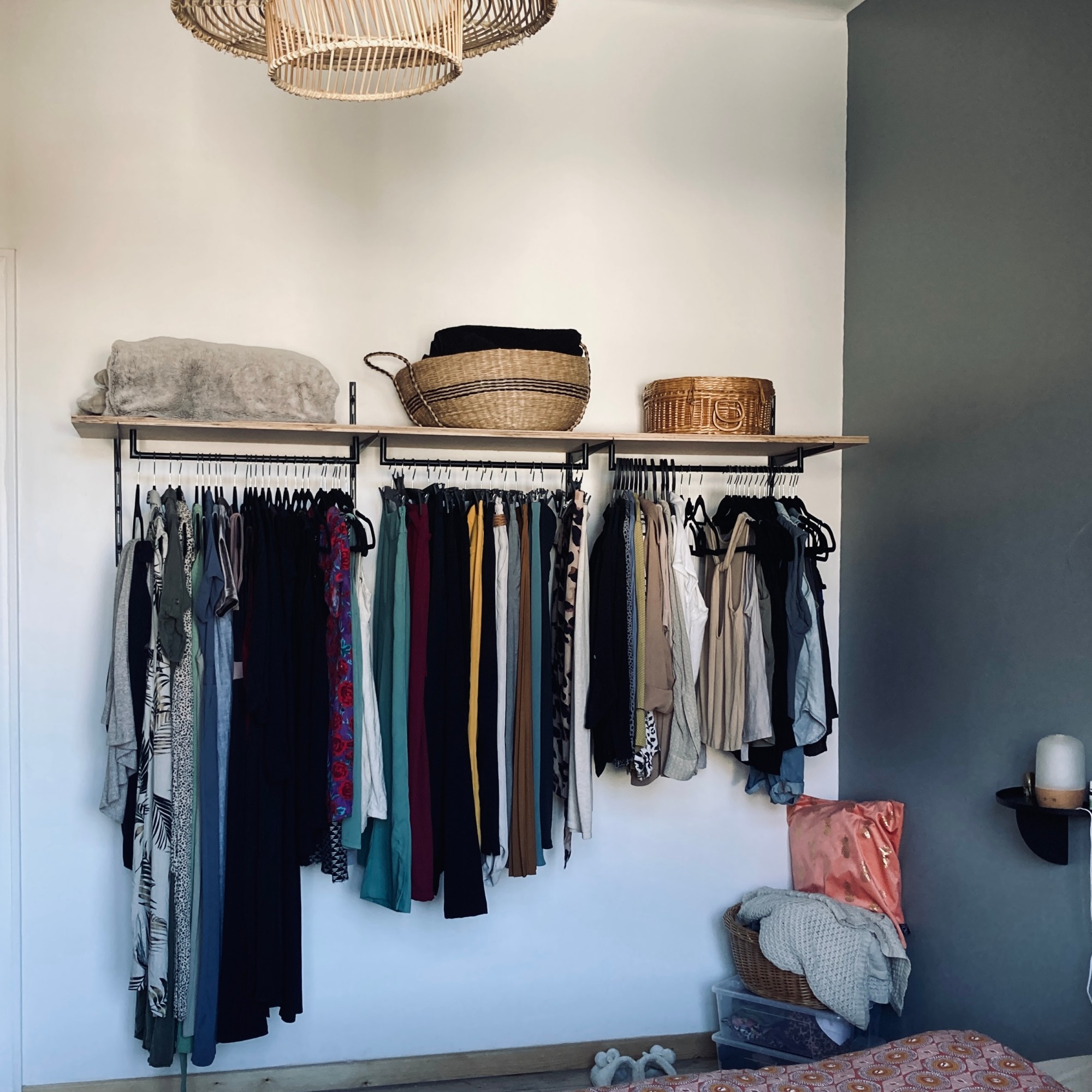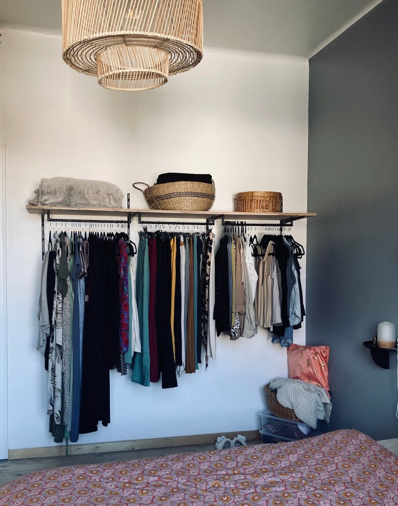 Non satisfaite de ce que je pouvais trouver sur le marché, j’ai décidé de créer une garde-robe minimaliste mais efficace, répondant à mes besoins d’optimisation de l’espace. Flottante, elle permet de maintenir un aspect léger (pas de garde-robe imposante et démesurée!) + elle me permet également d’apprécier le visuel des tissus et des couleurs que j’aime tant ! Le tout pour un dixième du prix de vente en magasin.