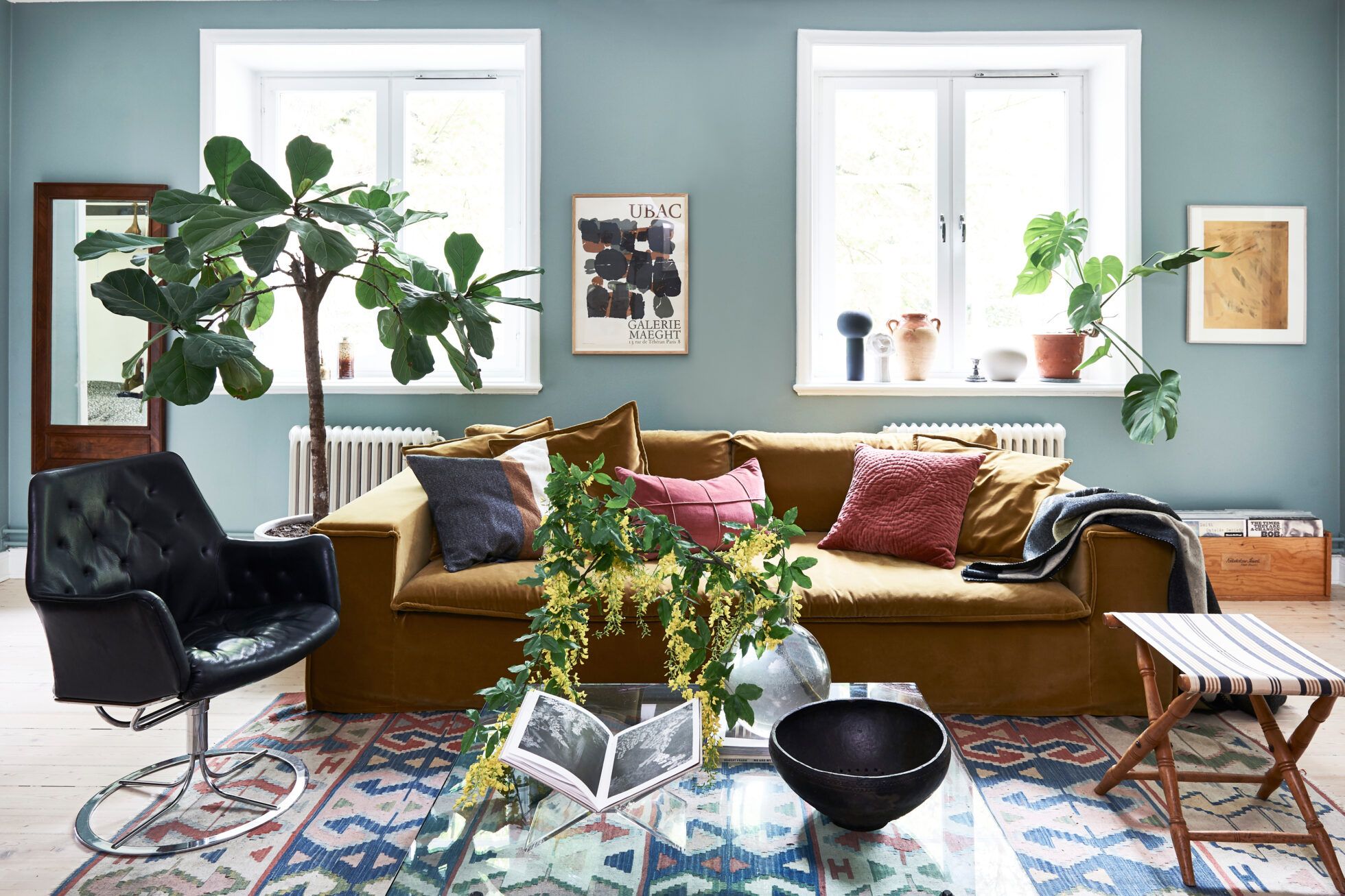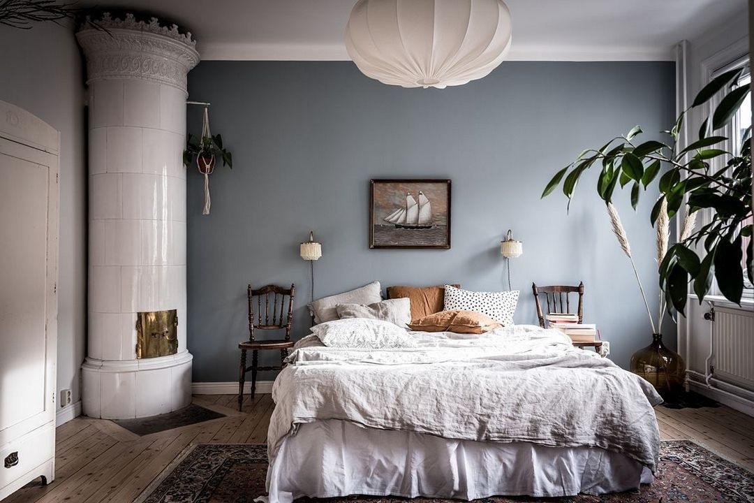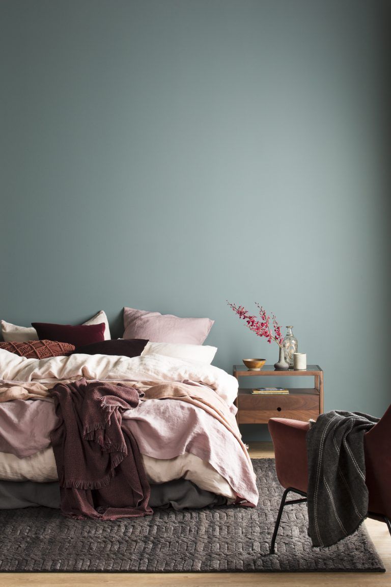 Well, because this blue-grey is quite strong already. I didn’t want to loose luminosity in the room and I wanted to create 2 separate spaces on purpose. Integrating a coloured wall was to break as well the overall boho look that spontaneously came up from my own personality and travels … It sometimes tends to take over and I didn’t want to overdo it.